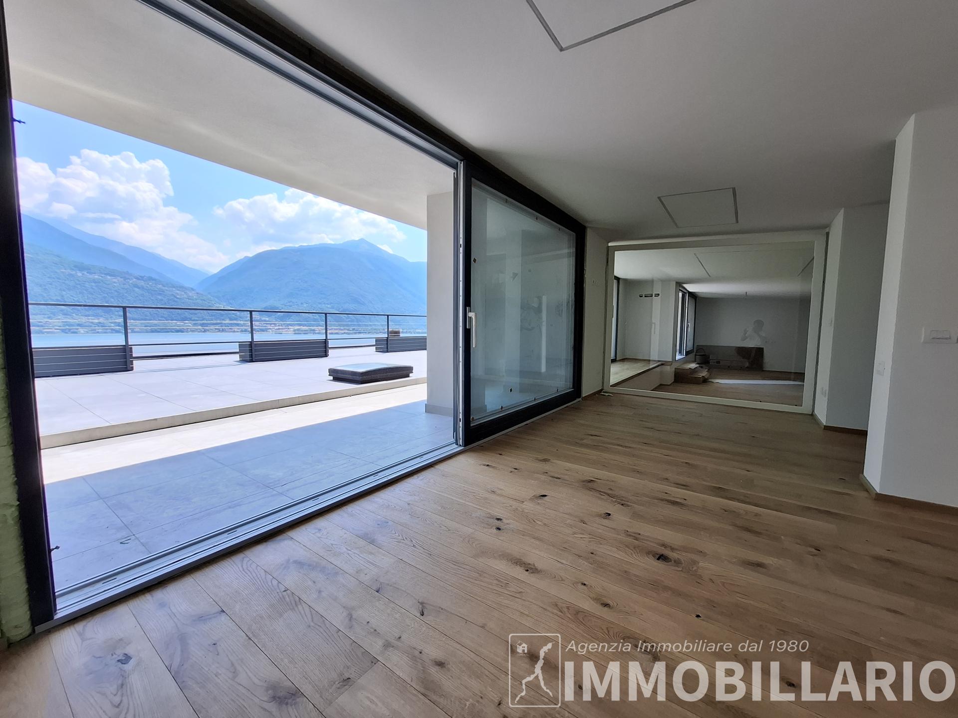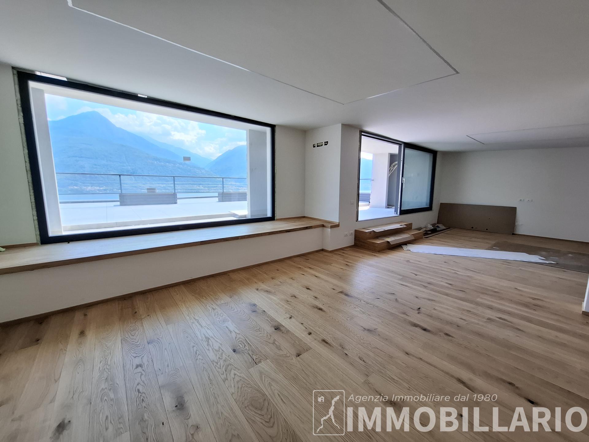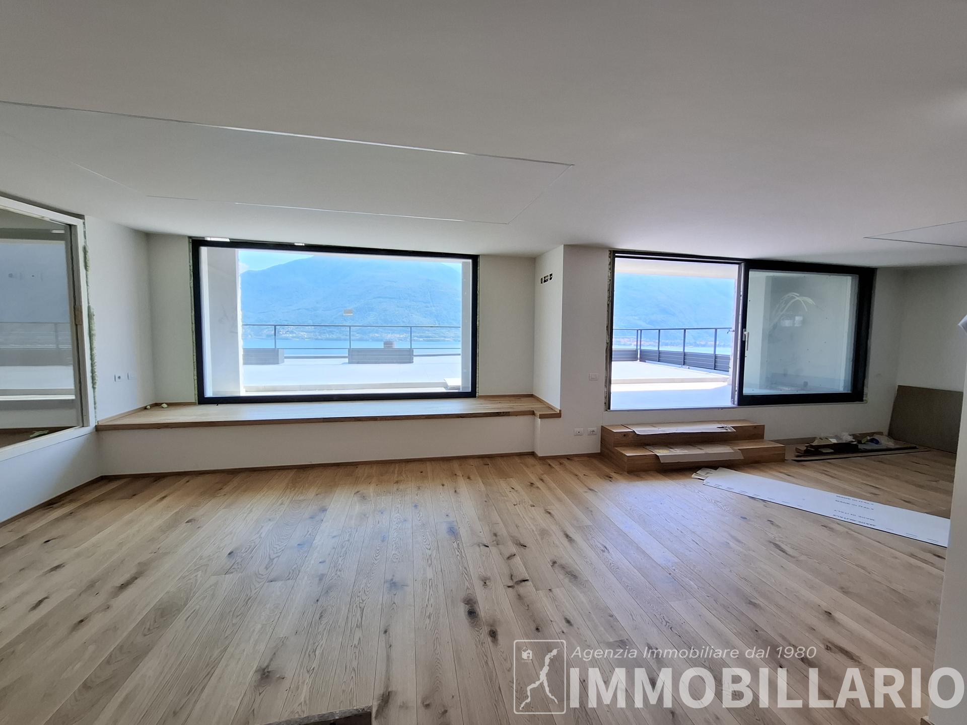 Disposizione degli ambienti L'immobile si sviluppa in modo funzionale su un unico livello. La zona giorno è dominata da un grande living con sala da pranzo, valorizzato da ampie vetrate continue che affacciano direttamente sul lago, e da una cucina abitabile separata. La zona notte è composta da una camera matrimoniale di generose dimensioni, un bagno finestrato, un locale lavanderia e un comodo ripostiglio. L'attico viene venduto da arredare, offrendo al futuro acquirente la massima libertà di personalizzare gli interni e scegliere il design più in linea con il proprio stile.